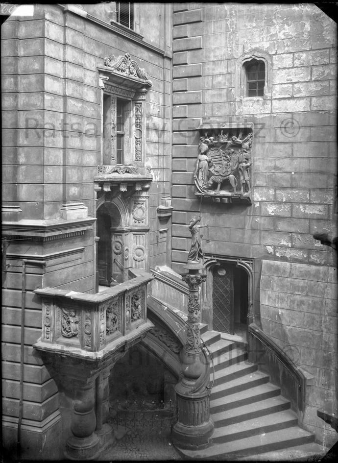 Rathaus, Rathaustreppe mit Justitiasäule von 1591, Wappen von 1488, Rathaus