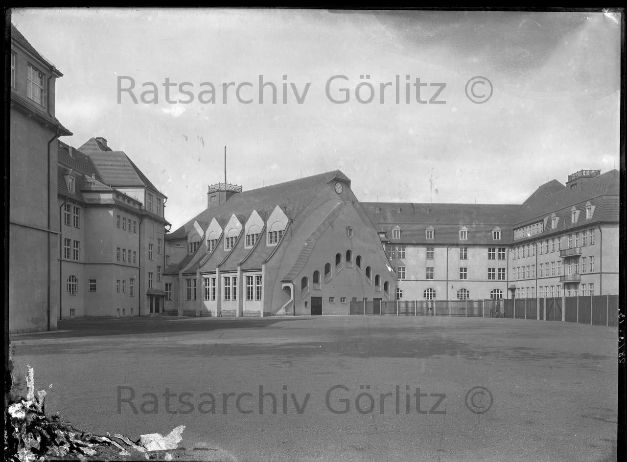 Schulhofansicht mit Turnhalle nach Fertigstellung 1913 der Oberrealschule und des Reform-Realgymnasiums Ecke Lessingstraße / Seydewitzstraße, 1913, Höhere Schule