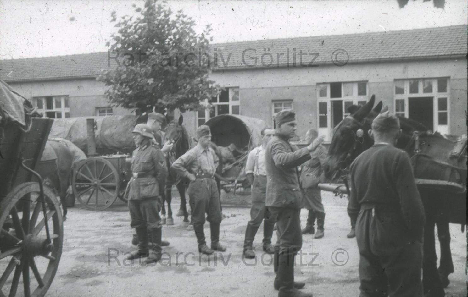Soldaten mit Pferdegespannen