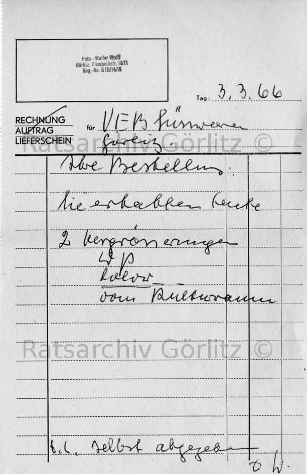Lieferschein des Fotografen Wolff, Fotoarbeiten