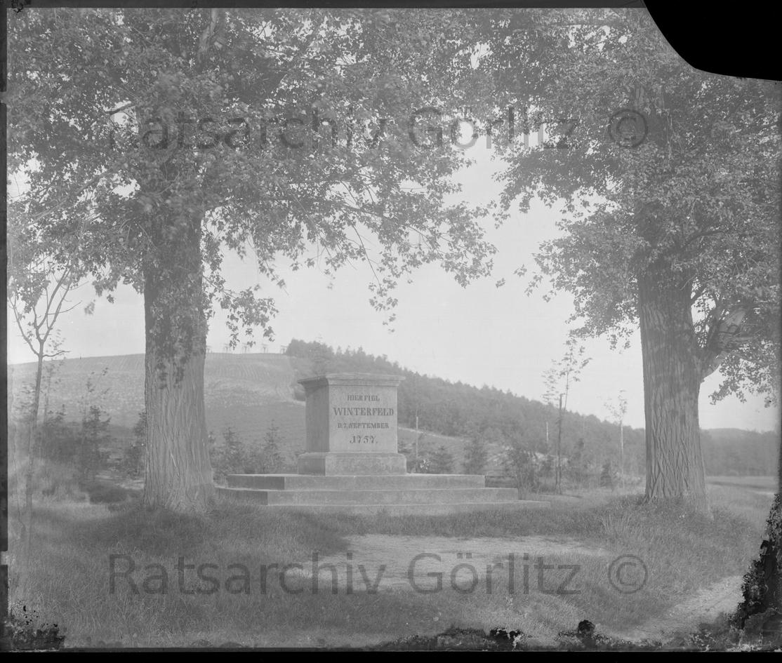 Granitstein mit Aufschrift "Hier fiel Winterfeld den 7.September 1757", am Jäkelsberg östlich der Neiße vor 1945, Denkmal