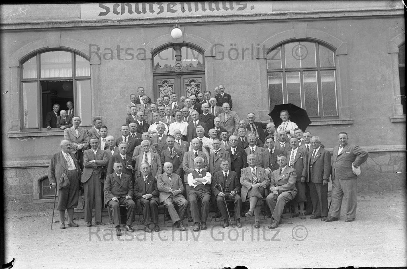 Gruppenaufnahme vor Schützenhaus, Person/Gruppe