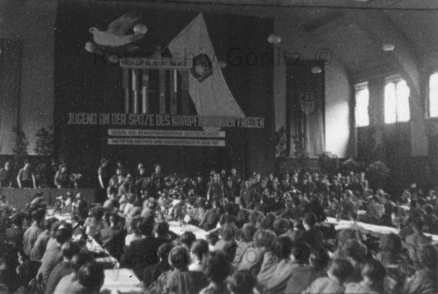 7. Kreisdelegiertenkonferenz der FDJ mit Margot Feist ( Honecker) in der Aula der Berufschule, in Vorbereitung der III Weltfestspiele (Berlin)