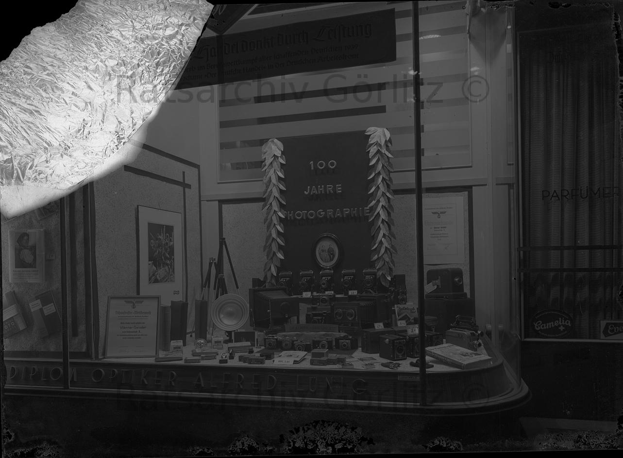 Schaufensterdekoration "hundert Jahre Foptographie" von Optiker Alfred Lünig, Geschäft