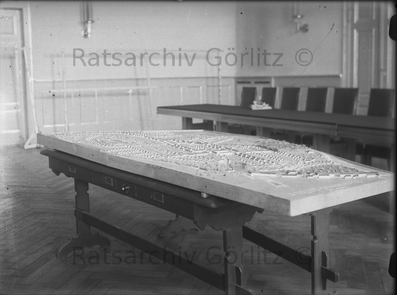 Sitzungssaal im Rathaus mit Modell der Stadt