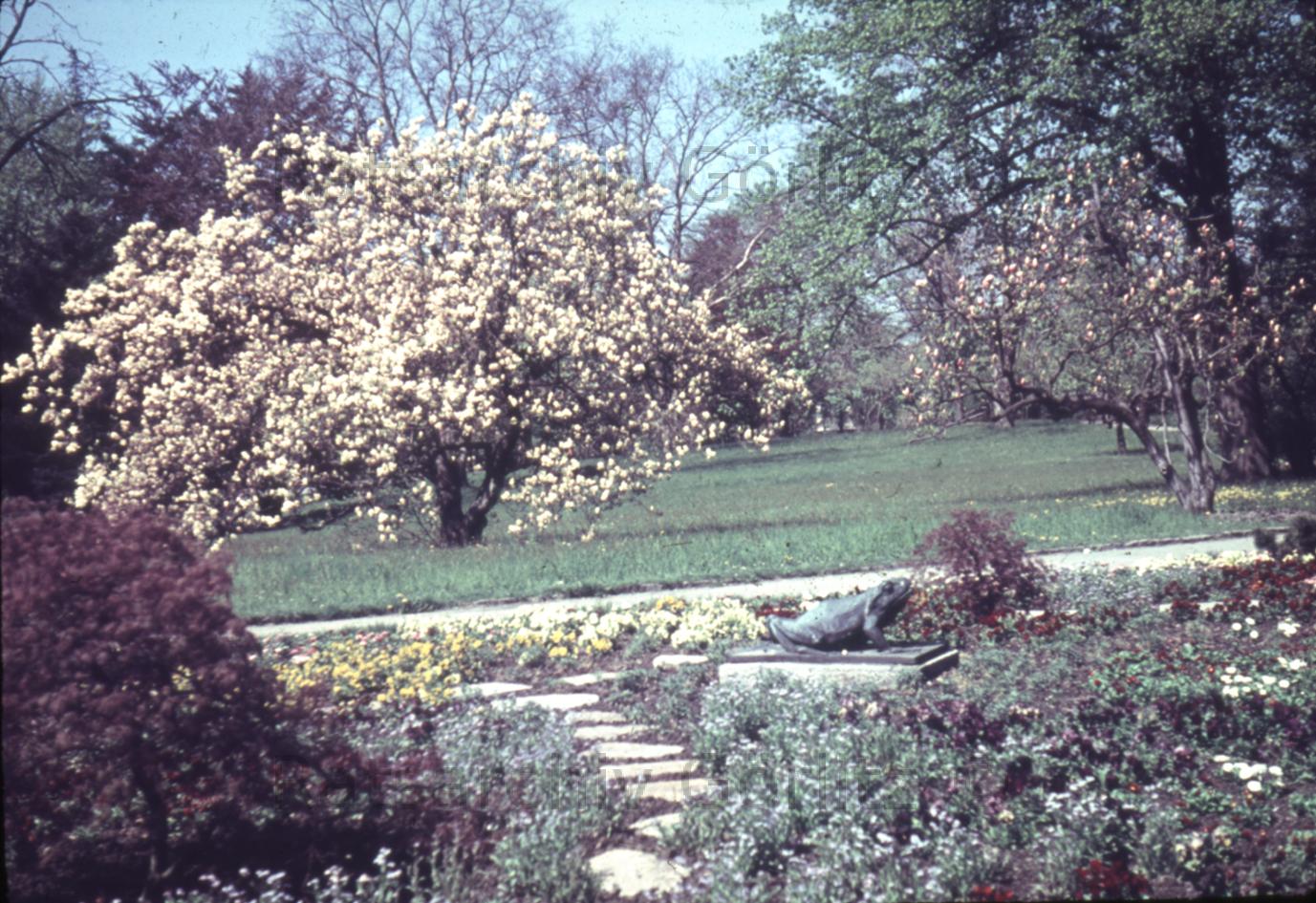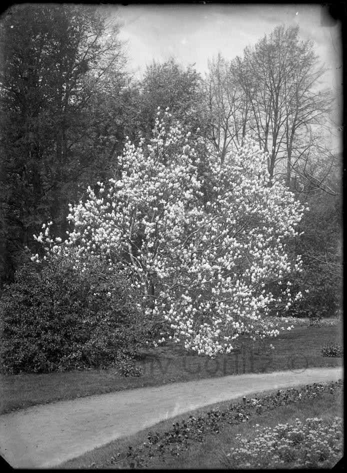 Parkhäusel, Froschbeet, mit Magnolie