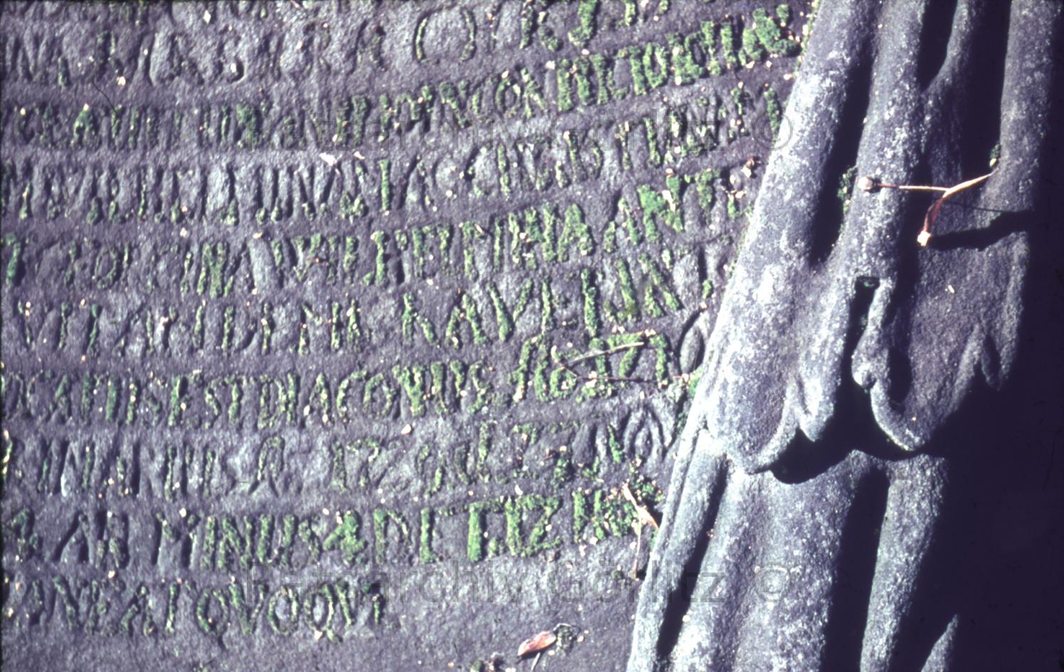 NikolaiFriedhof bemooste Schrift einer Grabplatte