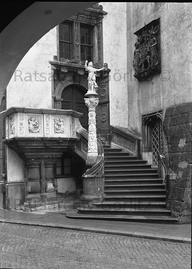 Rathaustreppe mit Justitiasäule, Rathaus