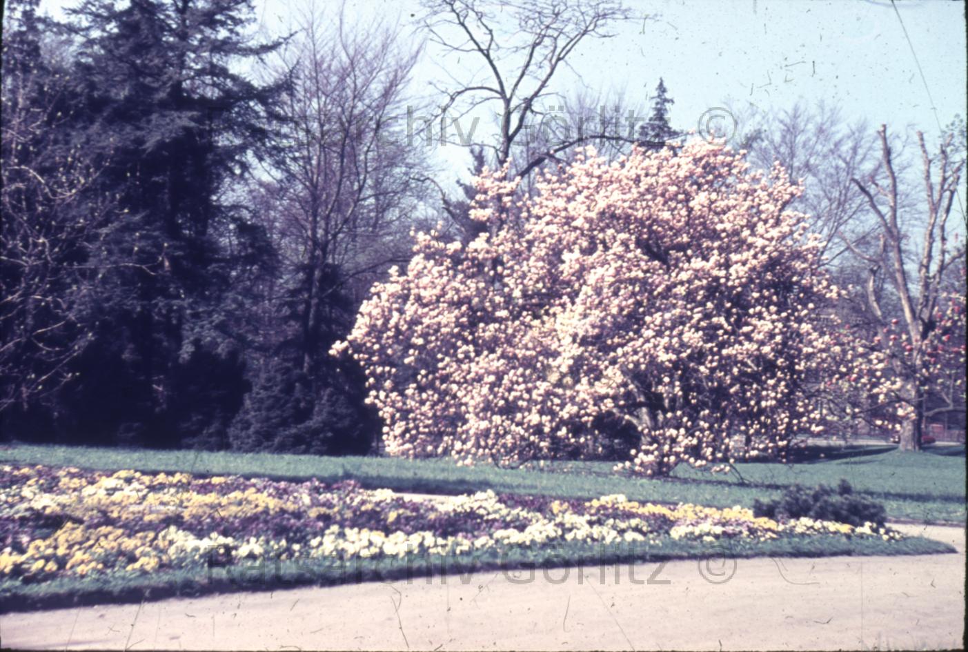 Parkhäusel, Froschbeet, mit Magnolie
