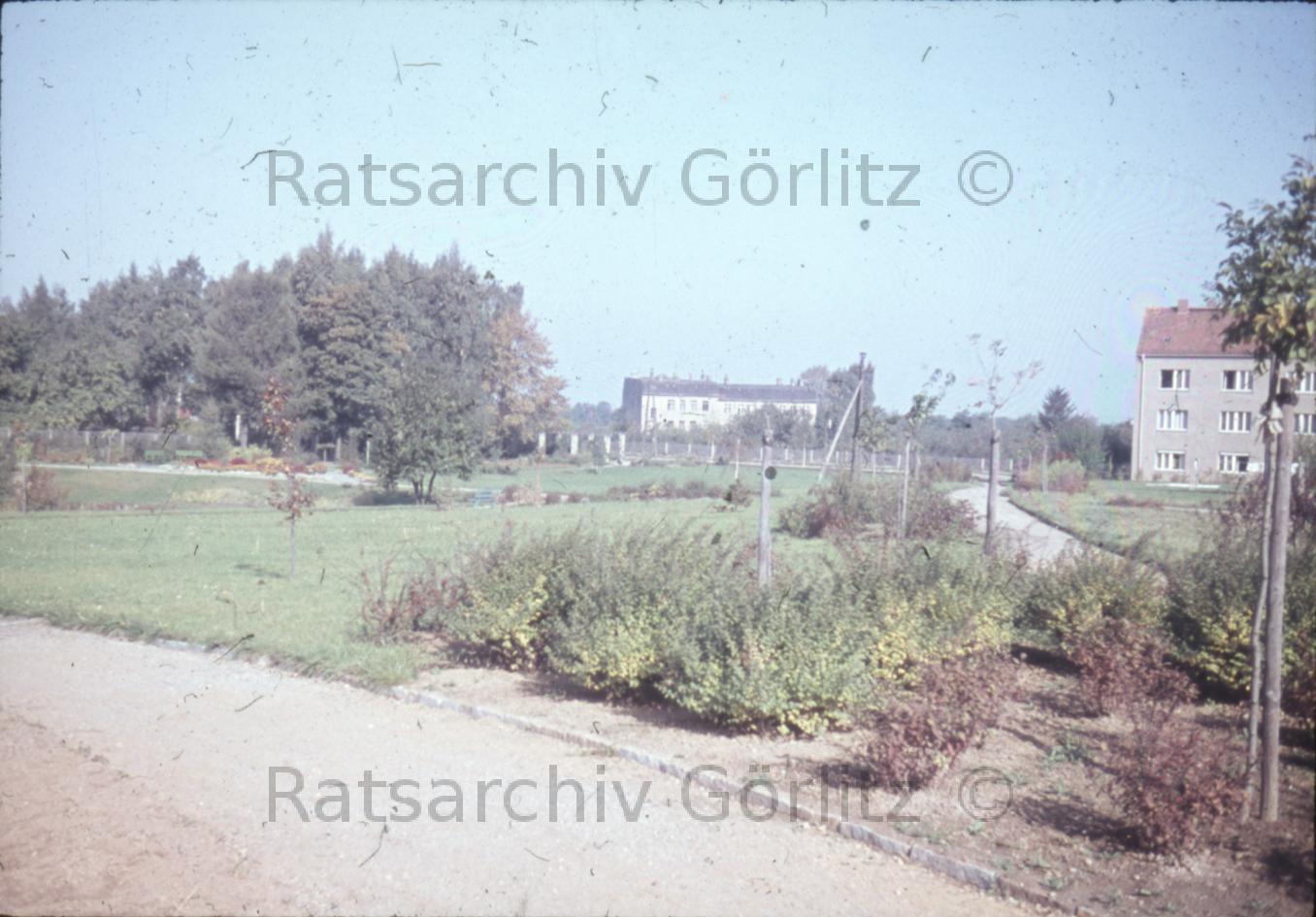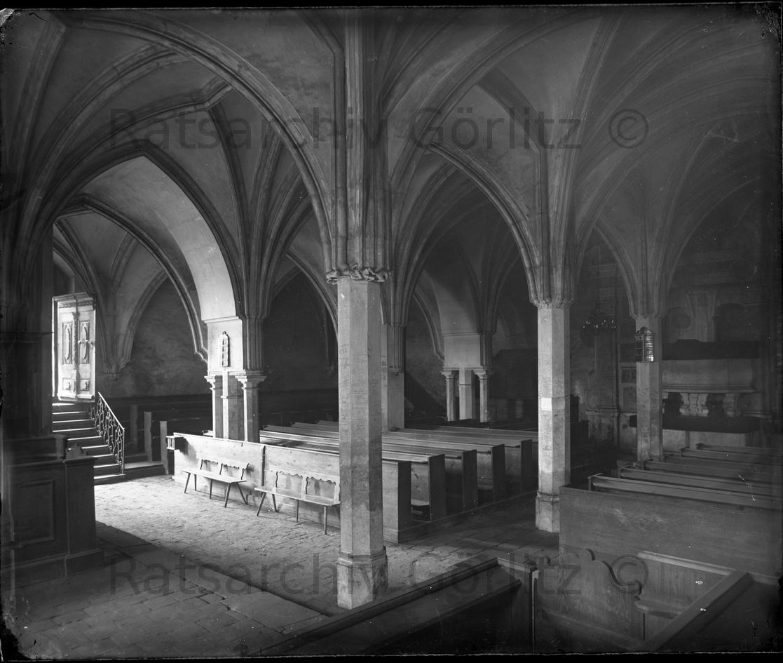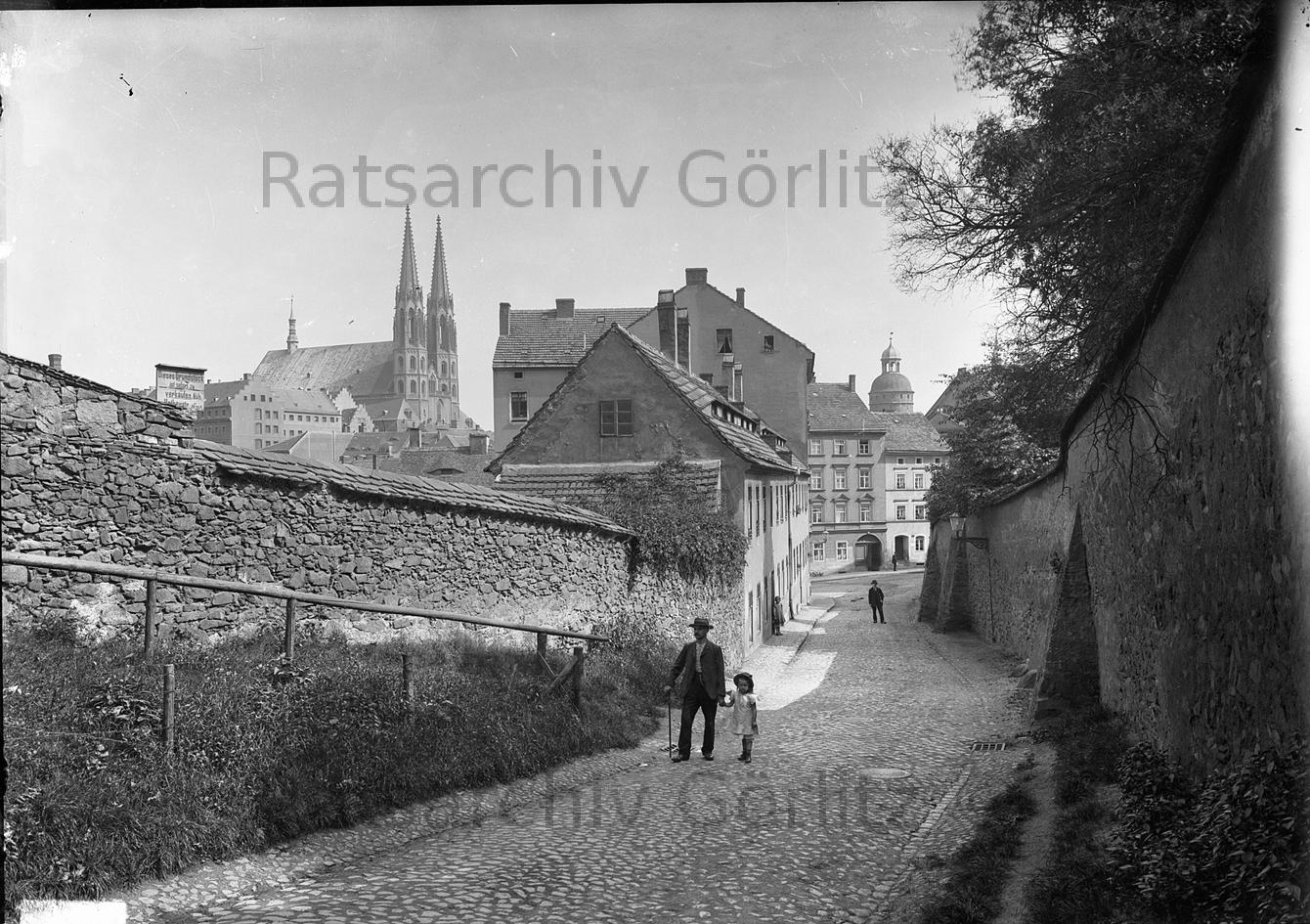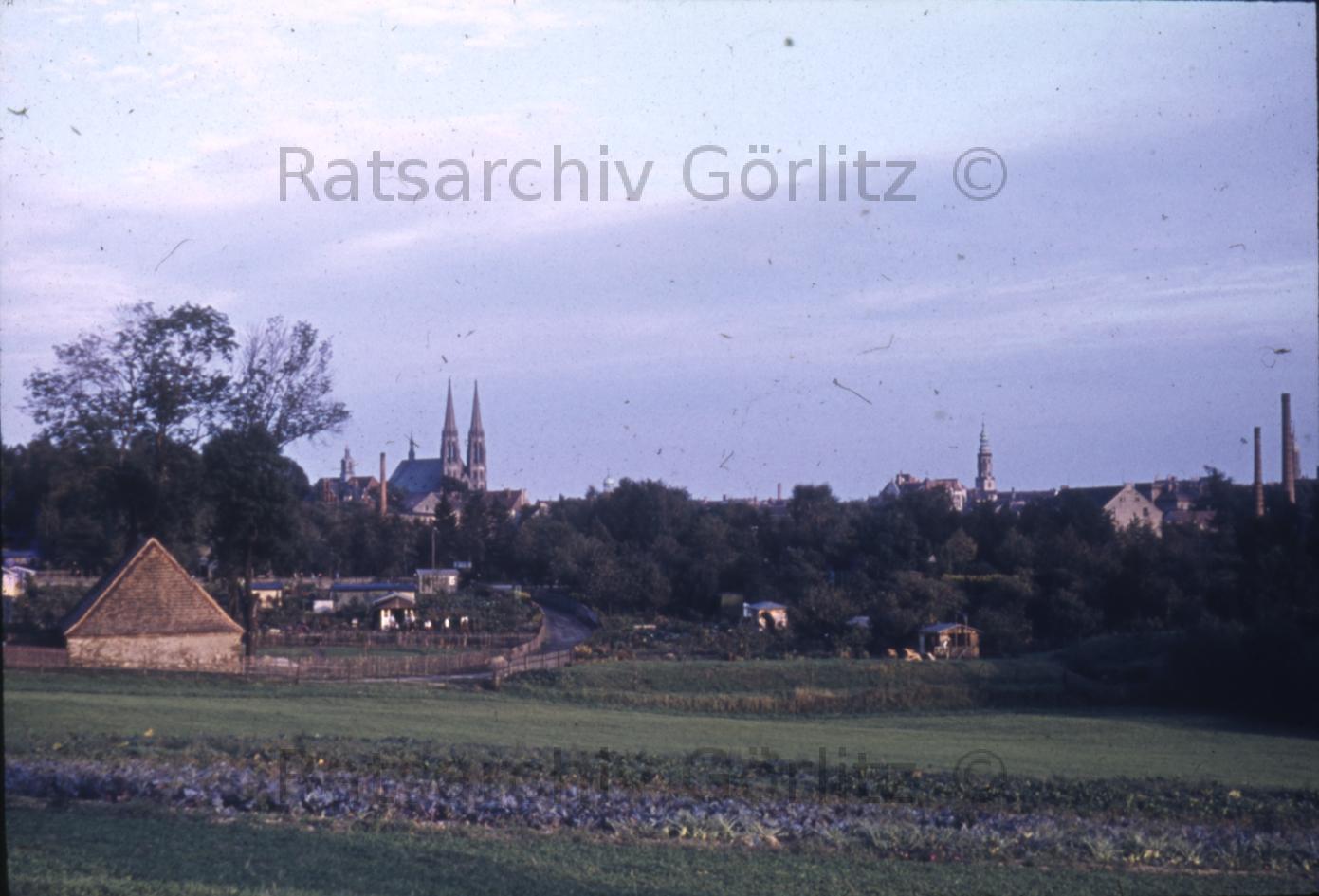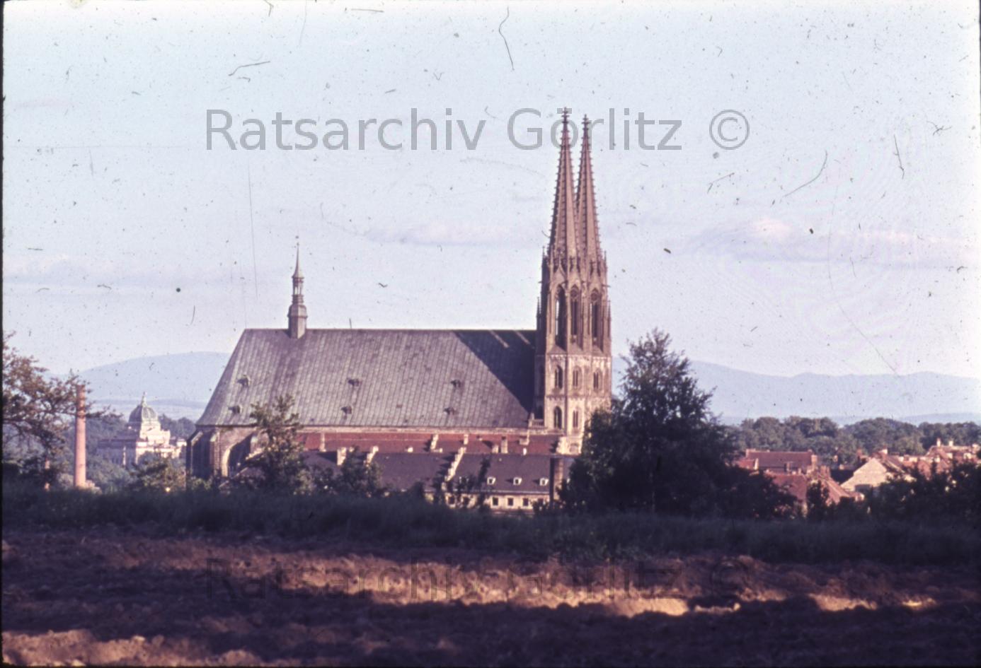 Blick in die Breslauer Straße mit Jakob-Böhme-Haus und Heilig-Geist-Kirche und Blick von der Ostseite zur Peterskirche, Kirche