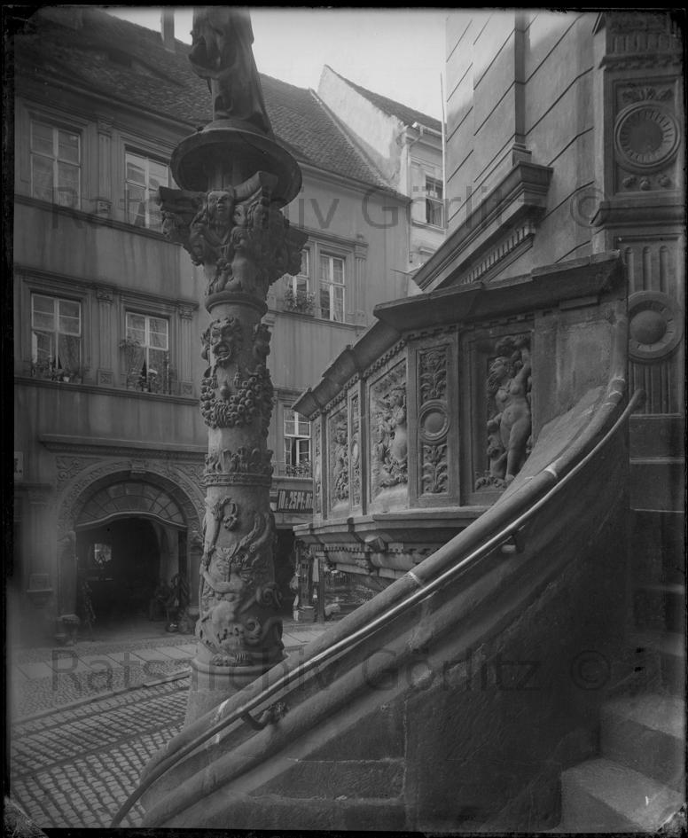 Justitia-Säule an der Rathaustreppe, Balkon am Rathaus von 1537 und Schönhof Portal von 1526, Brüderstraße 8, Rathaus