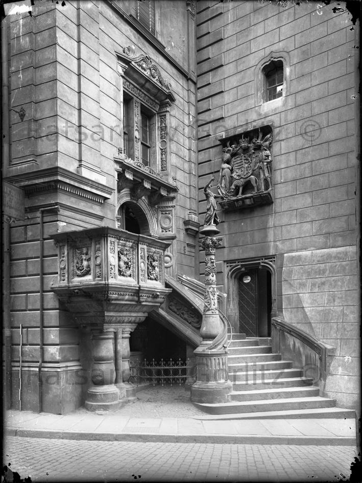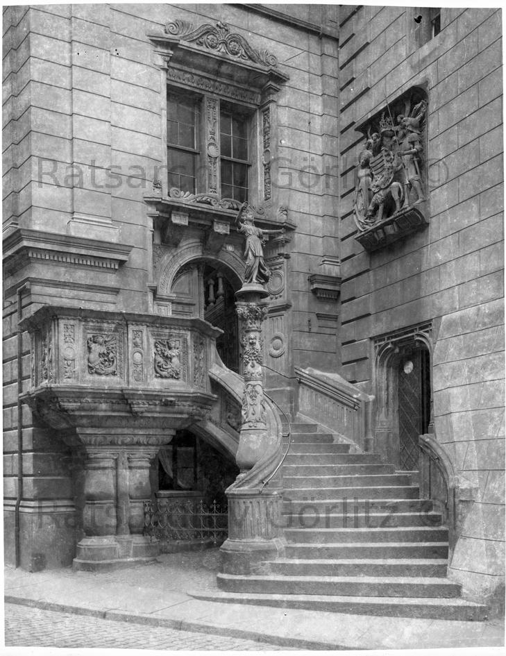 Rathaustreppe mit Justitiasäule und Wappen, Rathaus