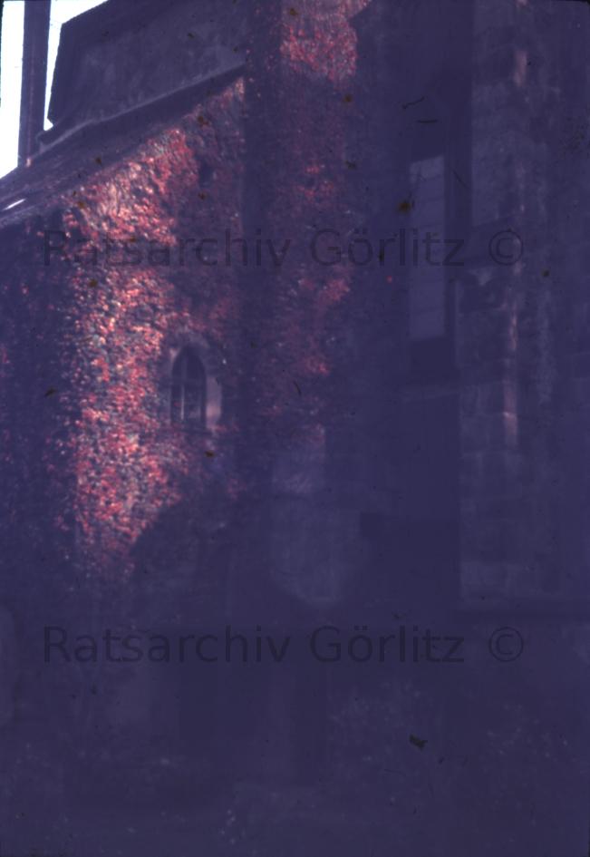 Peterskirche, steiler Treppenaufgang zur Südhalle um 1900, Teil von Sonnenuhr, Kirche