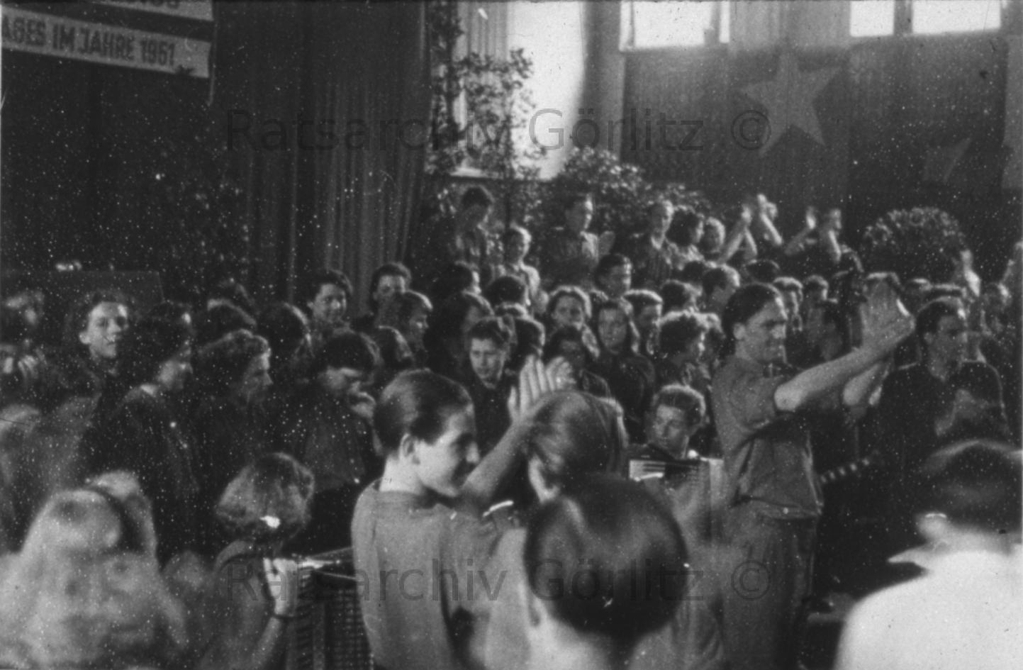 9. Kreisdelegiertenkonferenz der FDJ mit Margot Feist ( Honecker) in der Aula der Berufschule, in Vorbereitung der III Weltfestspiele (Berlin)
