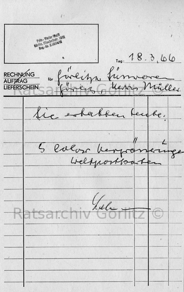 Lieferschein des Fotografen Wolff, Fotoarbeiten