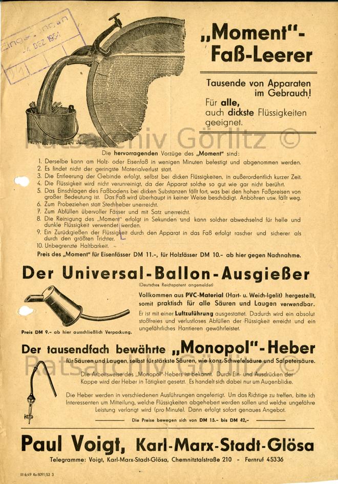 Preisliste Moment Faß-Leerer, Paul Voigt