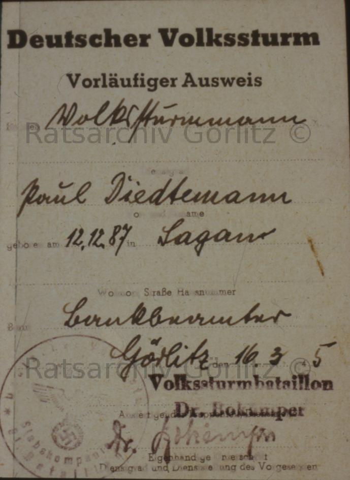 Ausweis deutscher Volkssturm Paul Diedtemann, unterzeichnet Volkssturmbattalion Dr. Bokämper