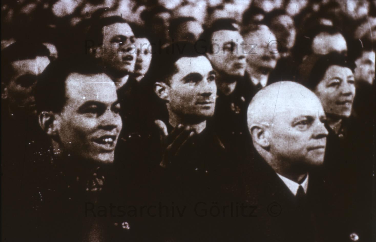 Stadthalle, vor Rüstungsarbeitern, Volkssturmangehörigen