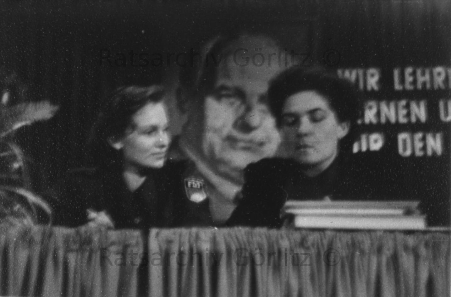 8. Kreisdelegiertenkonferenz der FDJ mit Margot Feist ( Honecker) in der Aula der Berufschule, in Vorbereitung der III Weltfestspiele (Berlin)