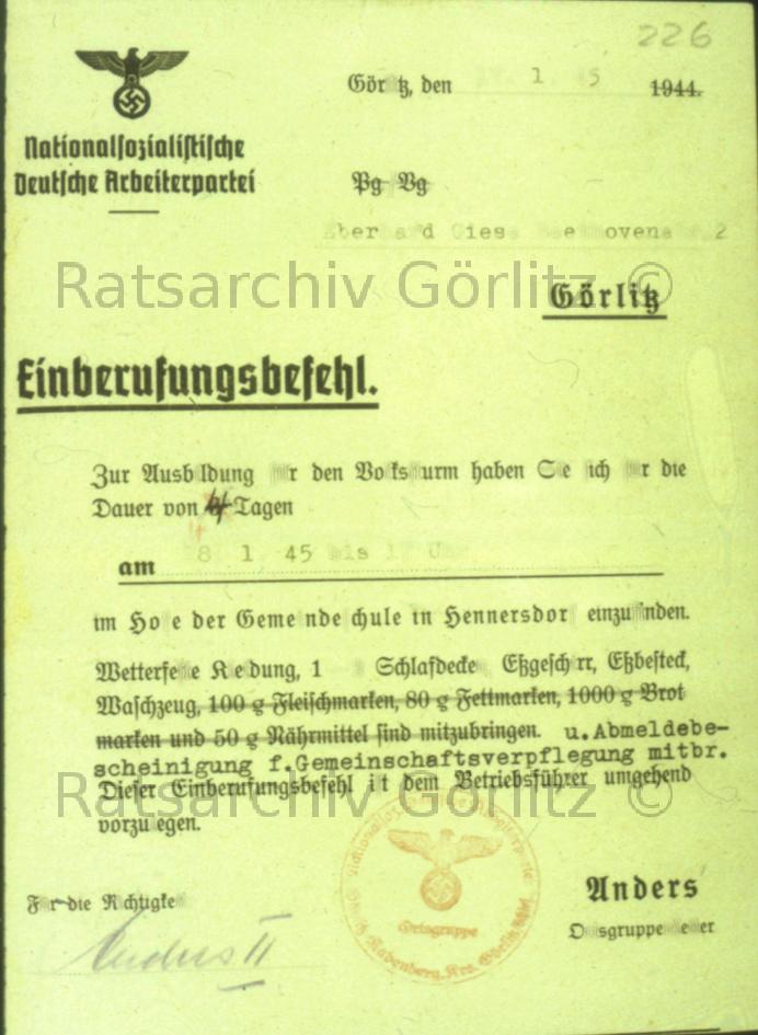 Einberufungsbefehl Ausbildung Volkssturm, unterzeichnet Anders Ortsgruppenführer
