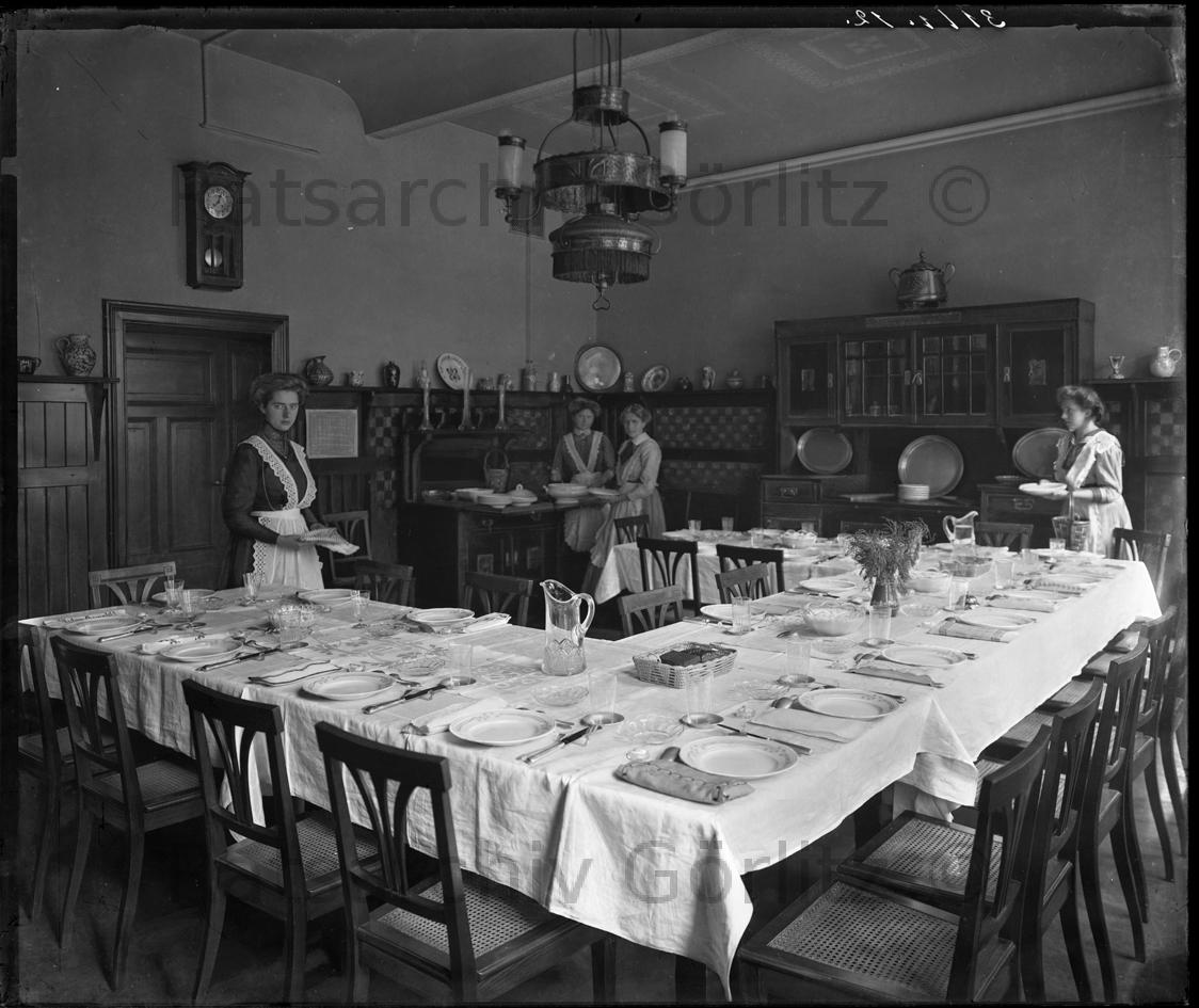 Haushalts- und Gewerbeschule, Küche, 1912 Räume der Mädchenmittelschule, Annengasse/Decken einer Speisetafel, Berufsschule