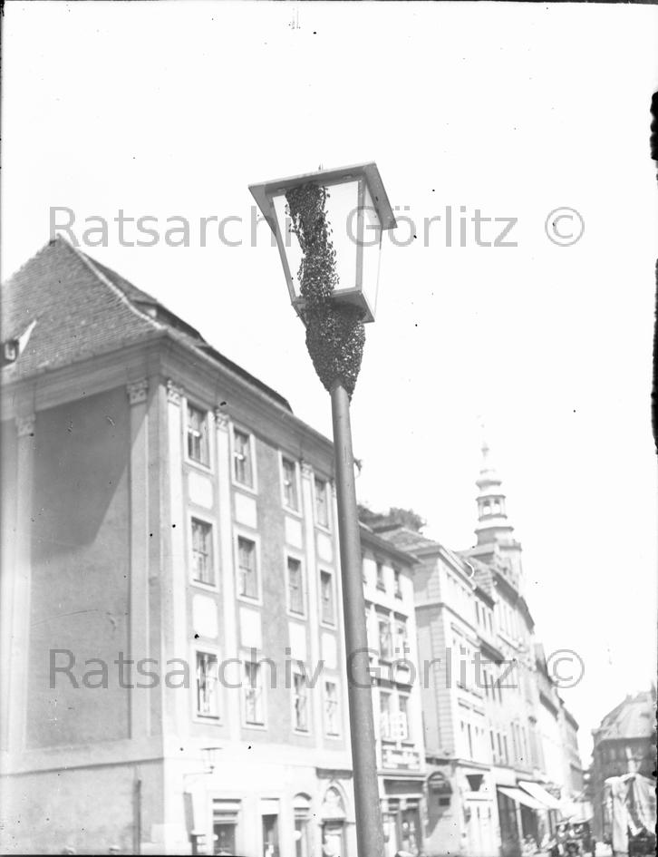 Am Obermarkt mit Blick in die Brüderstraße, Bienenschwarm an Laterne