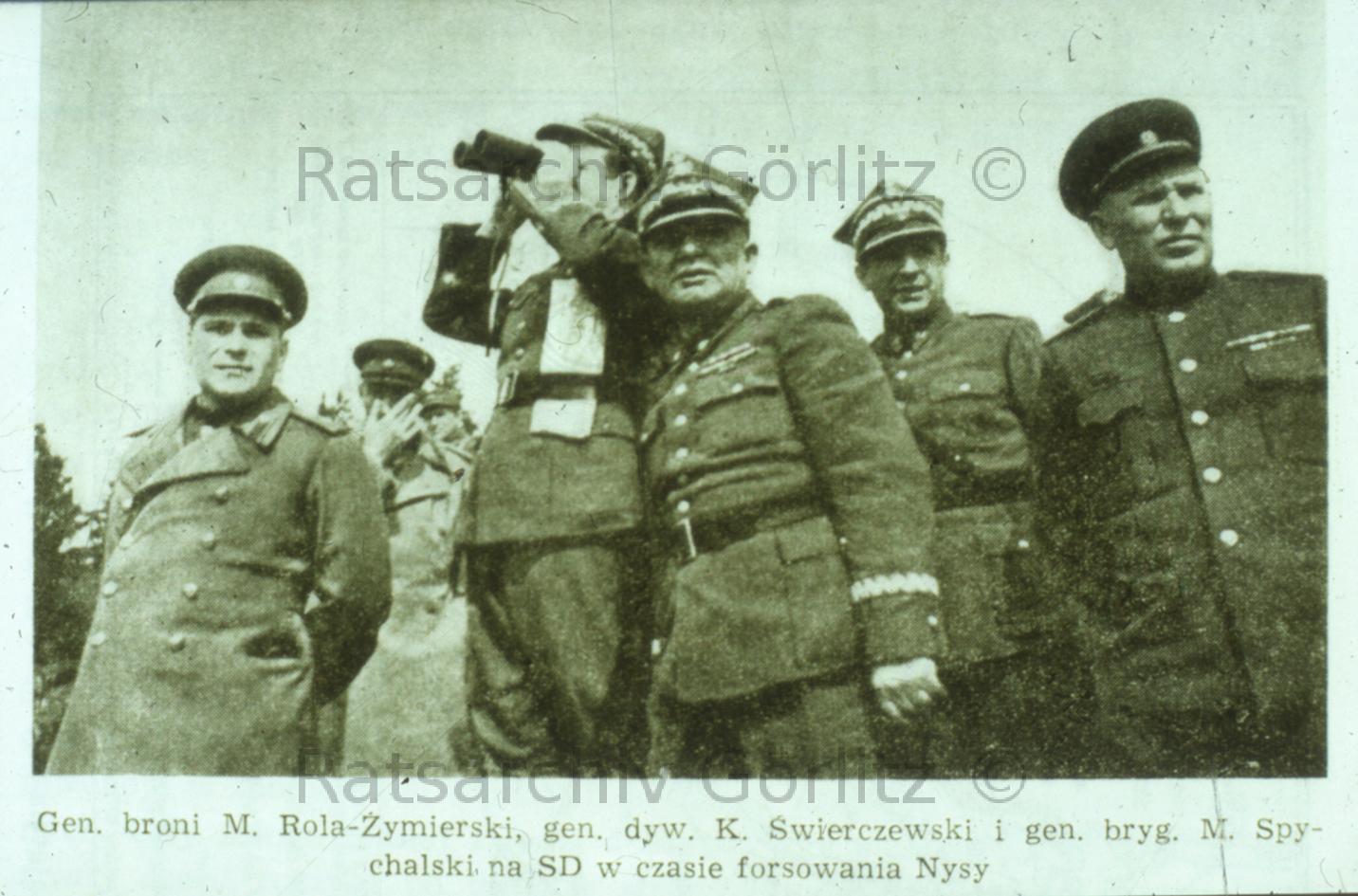 Div. General Swierczewski und Stabsoffiziere der I. VKF, beim Beobachten Forcierung an der Neiße