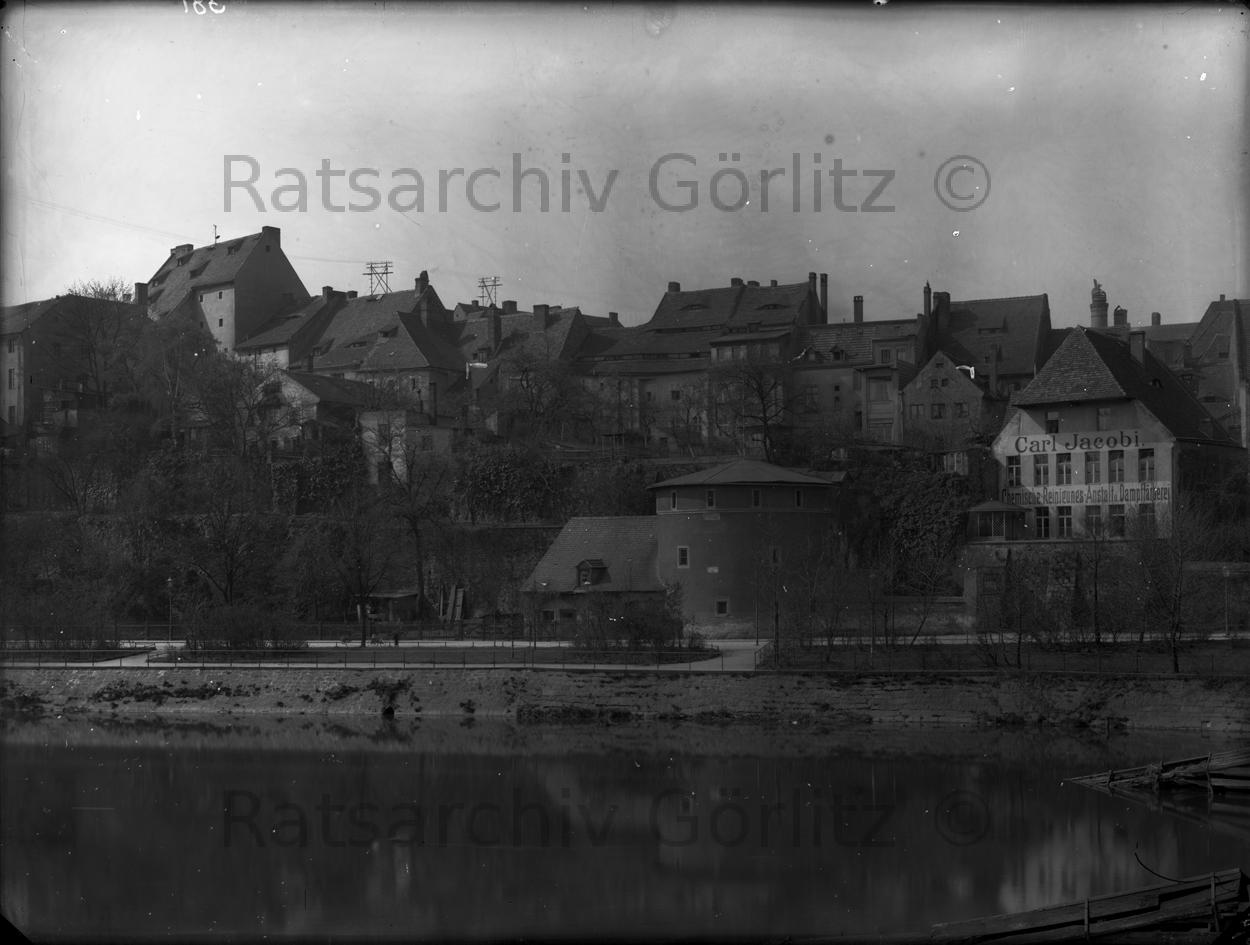 Blick vom rechten Neißeufer auf die Uferstraße Ochsenbastei, 1910, Befestigung