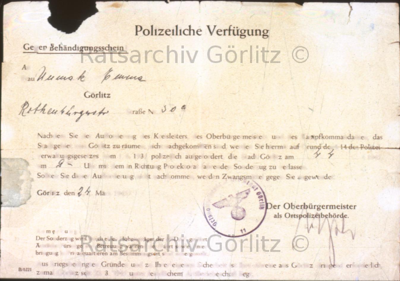 Zustellung Polizeiliche Verfügung, Evakuierungsbescheid für Emma Unmak Rothenburger Straße 50c