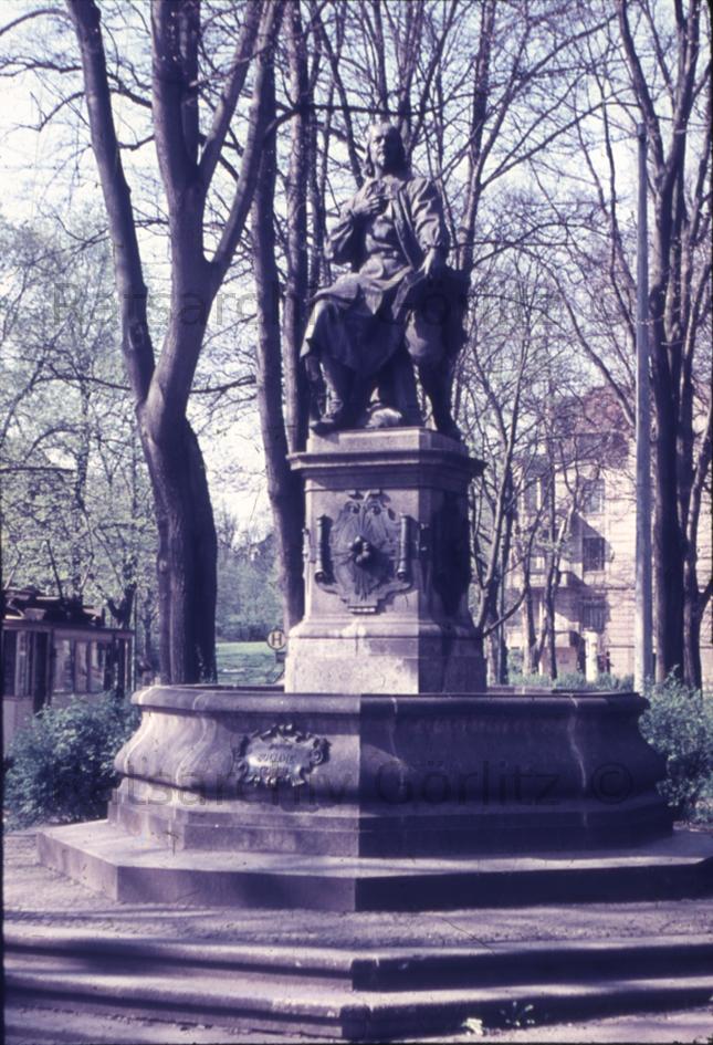 Jakob-Böhme Denkmal, mit Brunnen, im Winter