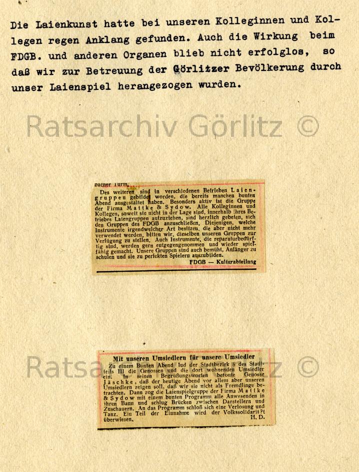 Chronik Kulturgruppe Mattke & Sydow Görlitz, über die Laienkunst