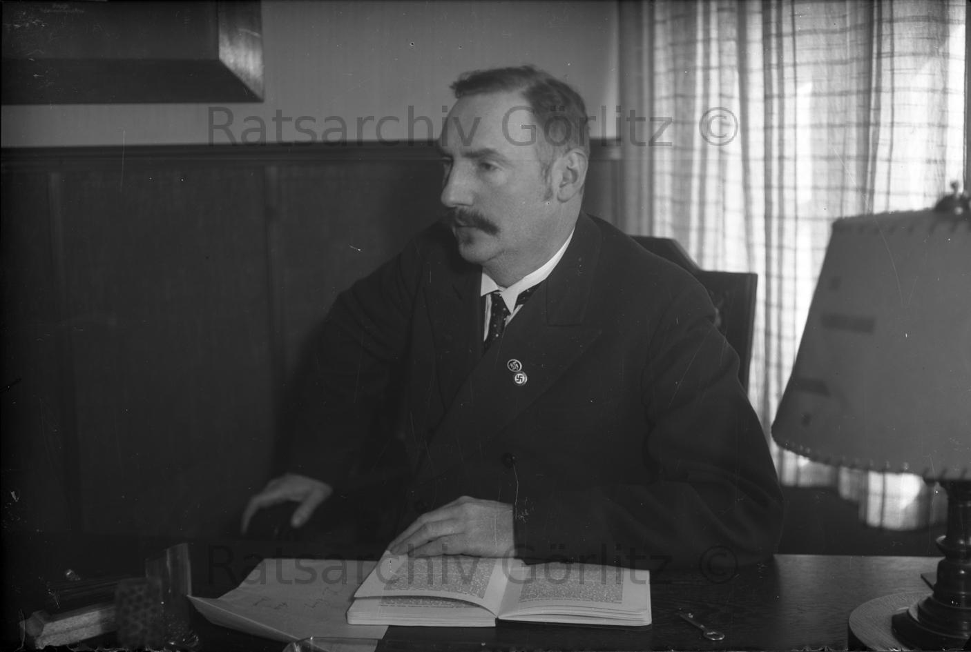 Mann am Schreibtisch mit NSDAP Parteiabzeichen, Porträt